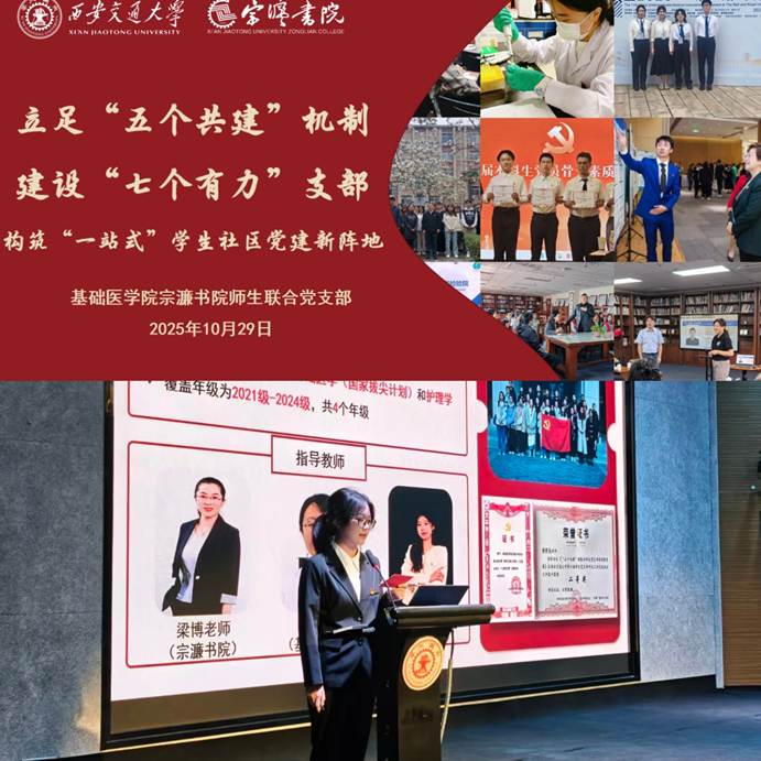 在2025年10月29日举行的西安交通大学第二十六届本科生“十佳党支部”评选中,基础医学院宗濂书院师生联合党支部凭借其扎实的党建工作成效和鲜明的共建特色,荣获校级“特色示范党支部”称号。这是该支部继2024年获评本科生“十佳党支部”后,在党建工作领域取得的又一重要成就。