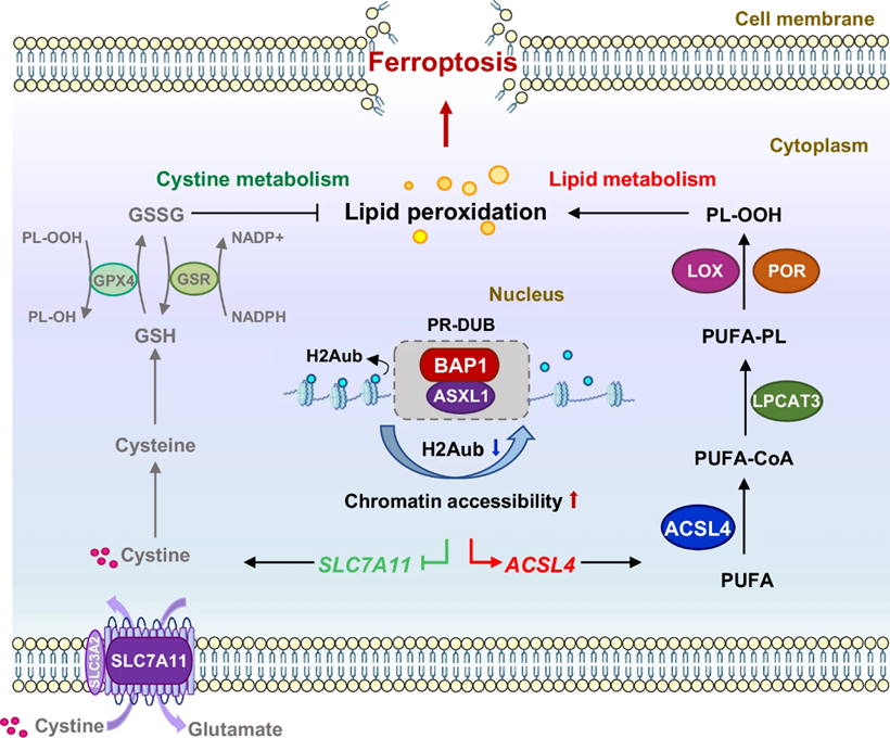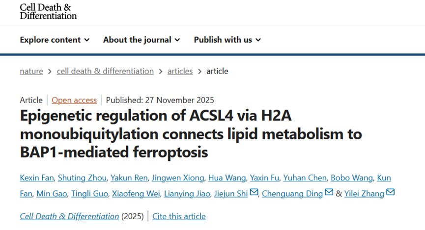 肿瘤的发生发展不仅涉及基因突变,更与表观遗传调控和代谢重编程密切相关。BRCA1相关蛋白1(BAP1)作为一种重要的核内去泛素化酶,通过去除组蛋白H2A第119位赖氨酸的单泛素化修饰(H2Aub),在基因转录调控中发挥关键作用。BAP1突变广泛存在于葡萄膜黑色素瘤、肾细胞癌、间皮瘤等多种恶性肿瘤中,与肿瘤发生发展密切相关。但BAP1调控基因转录表达的机制及其在代谢调控中作用有待深入研究。近日,西安交通大学张义磊教授联合同济大学史偈君教授团队于《Cell Death & Differentiation》杂志上发表题为“Epigenetic regulation of ACSL4 via H2A monoubiquitylation connects lipid metabolism to BAP1-mediated ferroptosis”的研究论文,揭示了BAP1通过H2Aub表过修饰调控ACSL4表达,驱动脂质代谢重编程,进而激活铁死亡的分子机制。