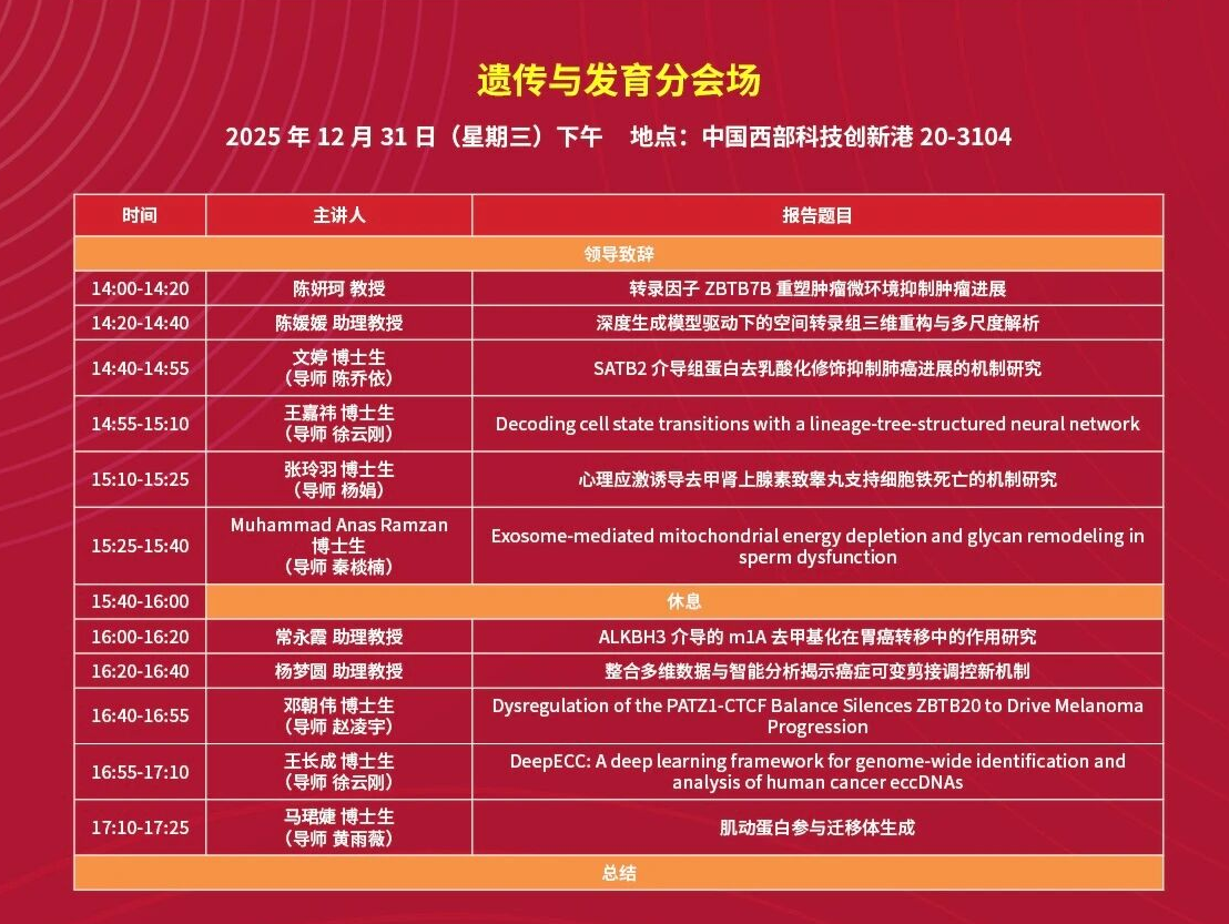 2025年12月31日下午,作为转化医学研究院2025年学术年会暨“泓仁学术周”、环境与疾病相关基因教育部重点实验室2025年学术年会的重要组成部分,遗传与发育研究所分论坛在中国西部科技创新港成功举办。论坛聚焦生命医学领域前沿方向,搭建学术交流平台,促进跨团队协作创新,来自研究所的师生代表齐聚一堂,共襄学术盛宴。
