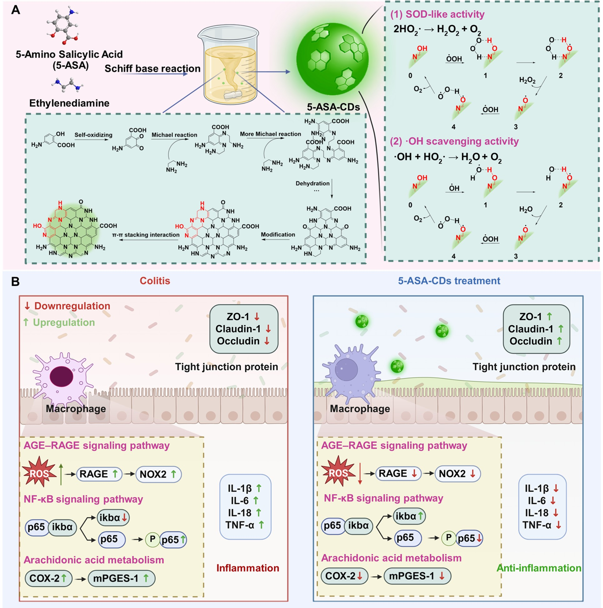 图1. 5-ASA-CDs的合成机制与治疗作用示意图。A.合成机制。5-ASA-CDs 在室温下通过5-ASA与乙二胺之间的希夫碱反应合成;B.治疗作用。5-ASA-CDs 通过调控NF-κB/AGE-RAGE信号通路和花生四烯酸代谢实现肠炎的治疗。