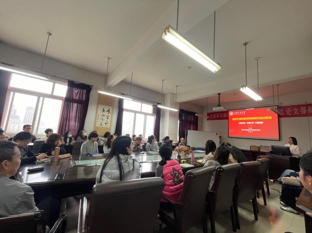 为深入贯彻习近平新时代中国特色社会主义思想和党的二十大精神,全面落实全国教育大会部署要求,扎实推进《新时代高校教师职业行为十项准则》落地生根,持续传承弘扬西迁精神,不断强化教师思想政治与师德师风建设,2026年4月21日下午,基础医学院生理学与病理生理学系师生联合党支部组织全体教师,开展了以《以德立身 以德立学 以德施教》为主题的高校教师师德师风专题培训。此次培训由系主任张莉教授主持,党支部书记罗肖教授担任主讲,全系以及心血管中心60余位教师参与了此次培训。