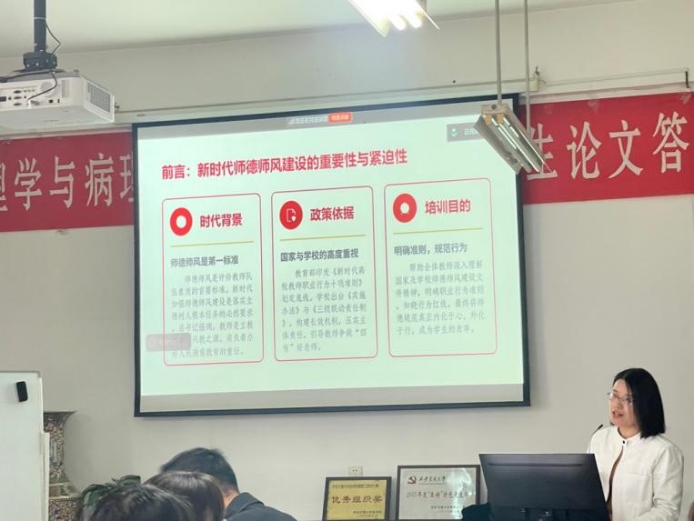 培训伊始,张莉主任结合学科特点与育人实际,阐释了开展此次师德师风专题培训的重要意义,强调生理学与病理生理学是连接基础医学与临床医学的核心桥梁课程,教师的道德修养直接影响医学生职业价值观的塑造,要求全体教师提高思想认识,主动把师德要求融入日常教学科研的全过程,自觉做学生为学、为事、为人的引路人。